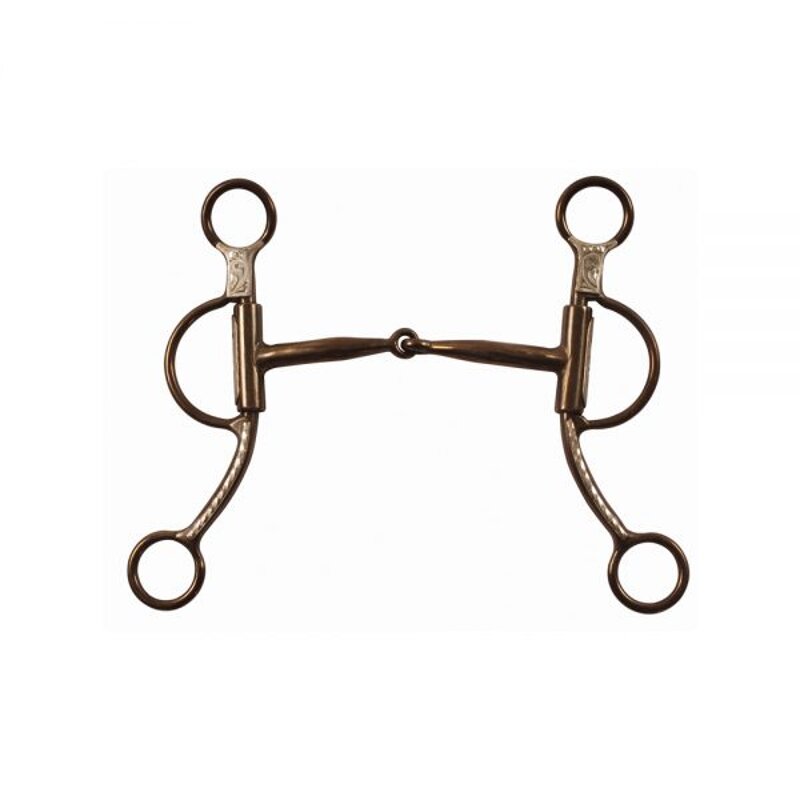 Morso western snodato in ferro brunito, imboccatura con inserti in rame, aste corte decorate. Misura 12,5 cm.