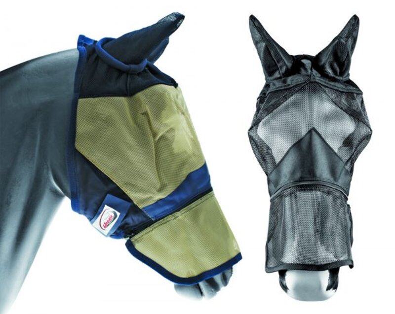 Maschera antimosche in PVC con copriorecchie, chiusura in velcro, con cerniera. Colori : Beige/Navy Blu, Nero. Misure : S - M - L - XL.
