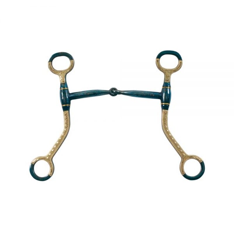 Morso western snodato in ferro blu, imboccatura con inserti in rame, aste corte piatte e decorate. Misura 12,5 cm.