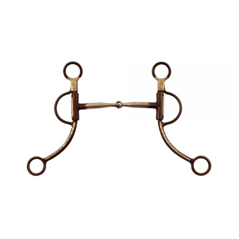 Morso western snodato in ferro brunito, imboccatura con inserti in rame, aste lunghe decorate. Misura 12,5 cm.