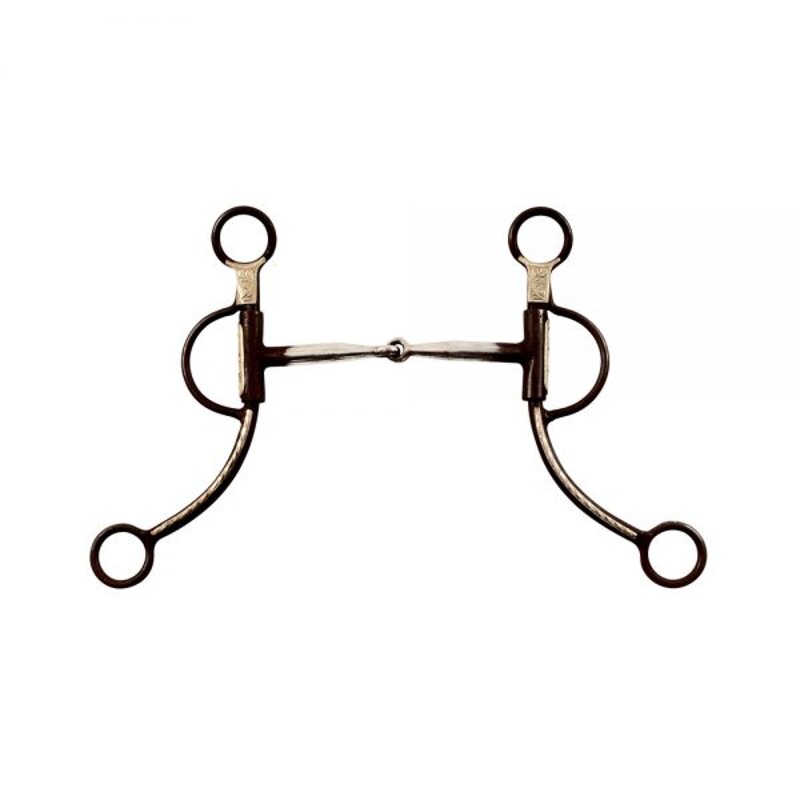 Morso western snodato in ferro nero, imboccatura con inserti in rame, aste lunghe con argenti. Misura 12,5 cm.