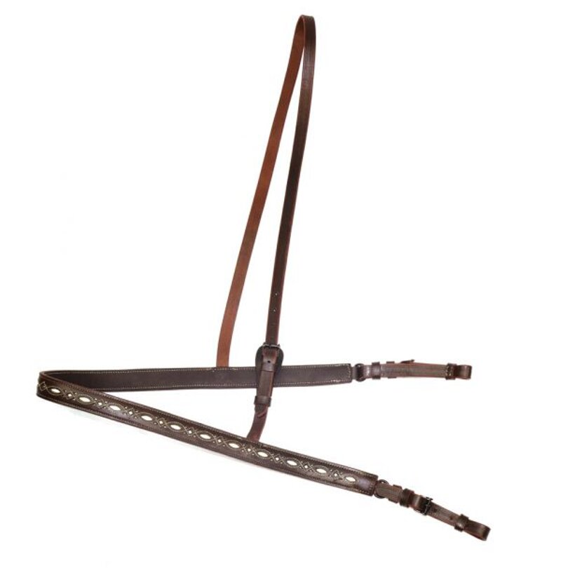 Pettorale in cuoio regolabile con riporti bianchi. Misure : Unica. Colori : Testa di Moro, Nero.