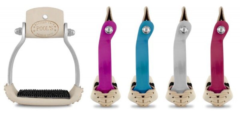 Staffe western da Barrel in alluminio con pedana rivestita in cuoio e gomma antiscivolo. Colori: Rosa - Rosso - Blu - Alluminio.