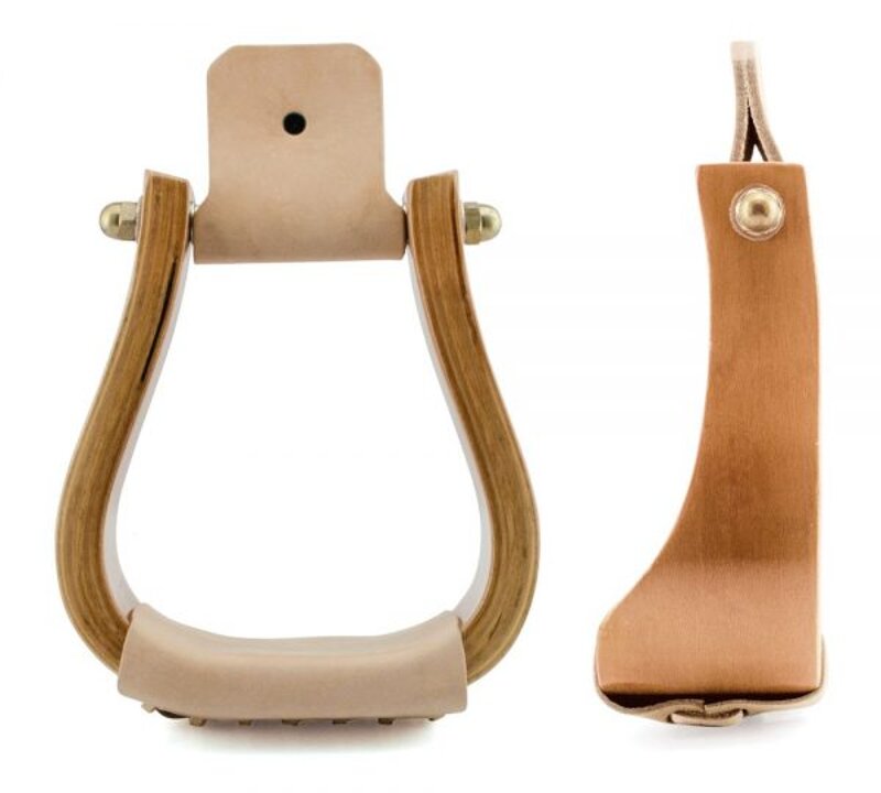 Staffe western Metalab sagomate in legno con pedane rivestite in cuoio.