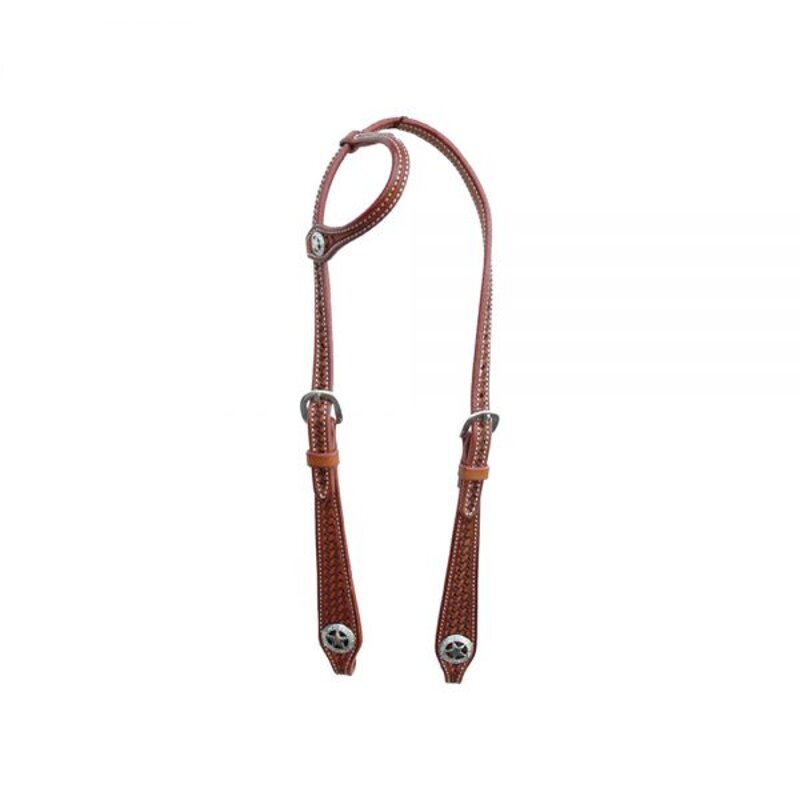 Testiera western Pool’s ad orecchio con lavorazione basket e cuciture. Misura unica. Colori: Cuoio Naturale, Cuoio Ingrassato.