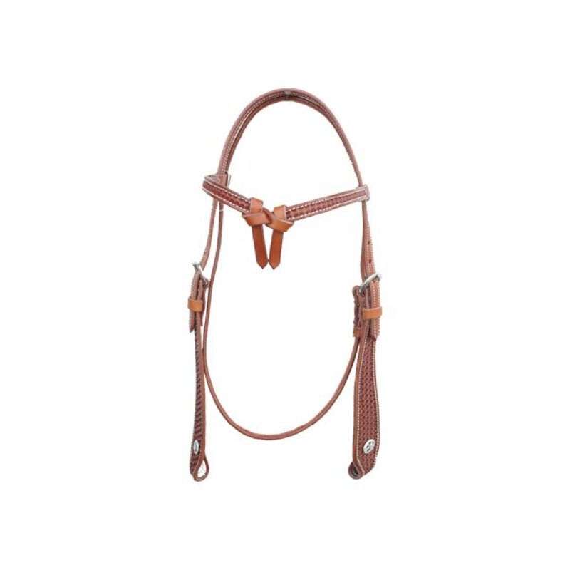 Testiera western Pool’s con frontalino a fiocco e lavorazioni basket. Misura unica. Colori: Cuoio Naturale, Cuoio Ingrassato.
