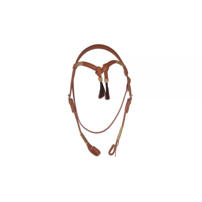 Briglia western frontalino a fiocco con crine, rifiniture rawhide, completa di redini. Misura unica. Colori: Cognac, Testa di moro, Nero.