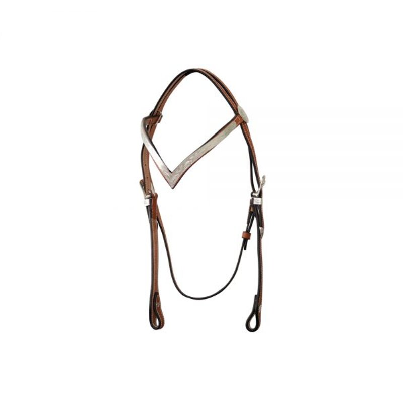 Testiera western Pool’s con frontalino a “V” e riporti argentati. Misura unica. Colori: Cuoio Naturale, Cuoio Ingrassato.