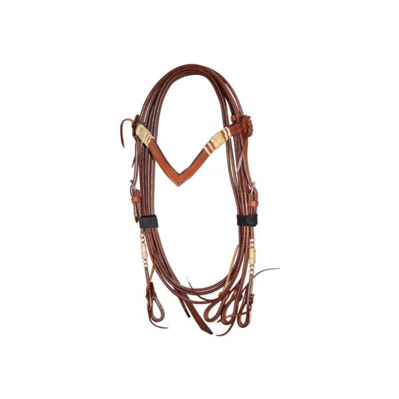 Briglia western frontalino a “V”, rifiniture rawhide, completa di redini. Misura unica. Colori: Cognac, Testa di moro, Nero